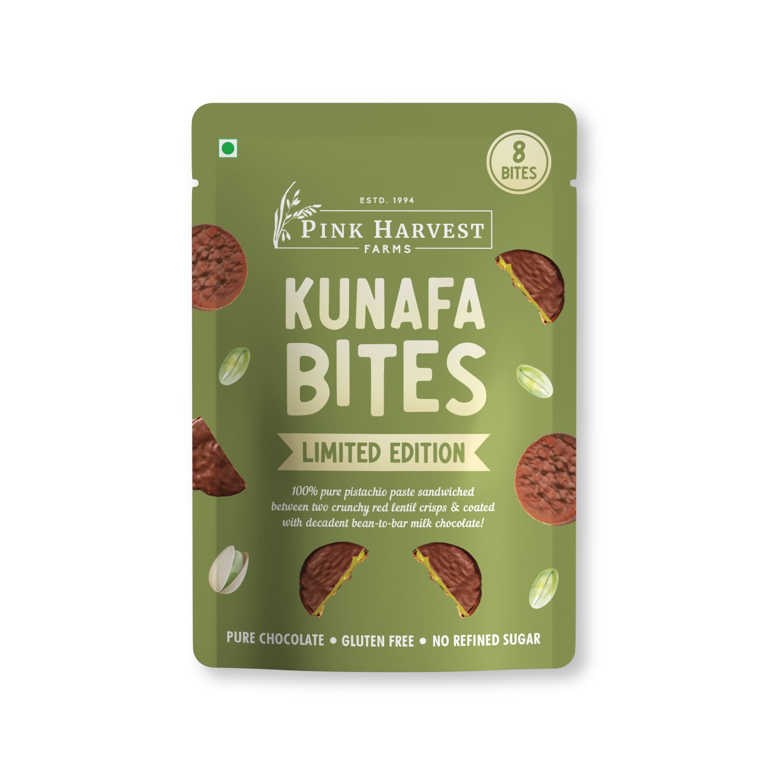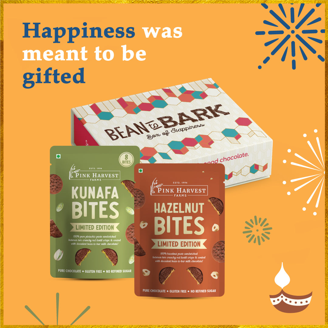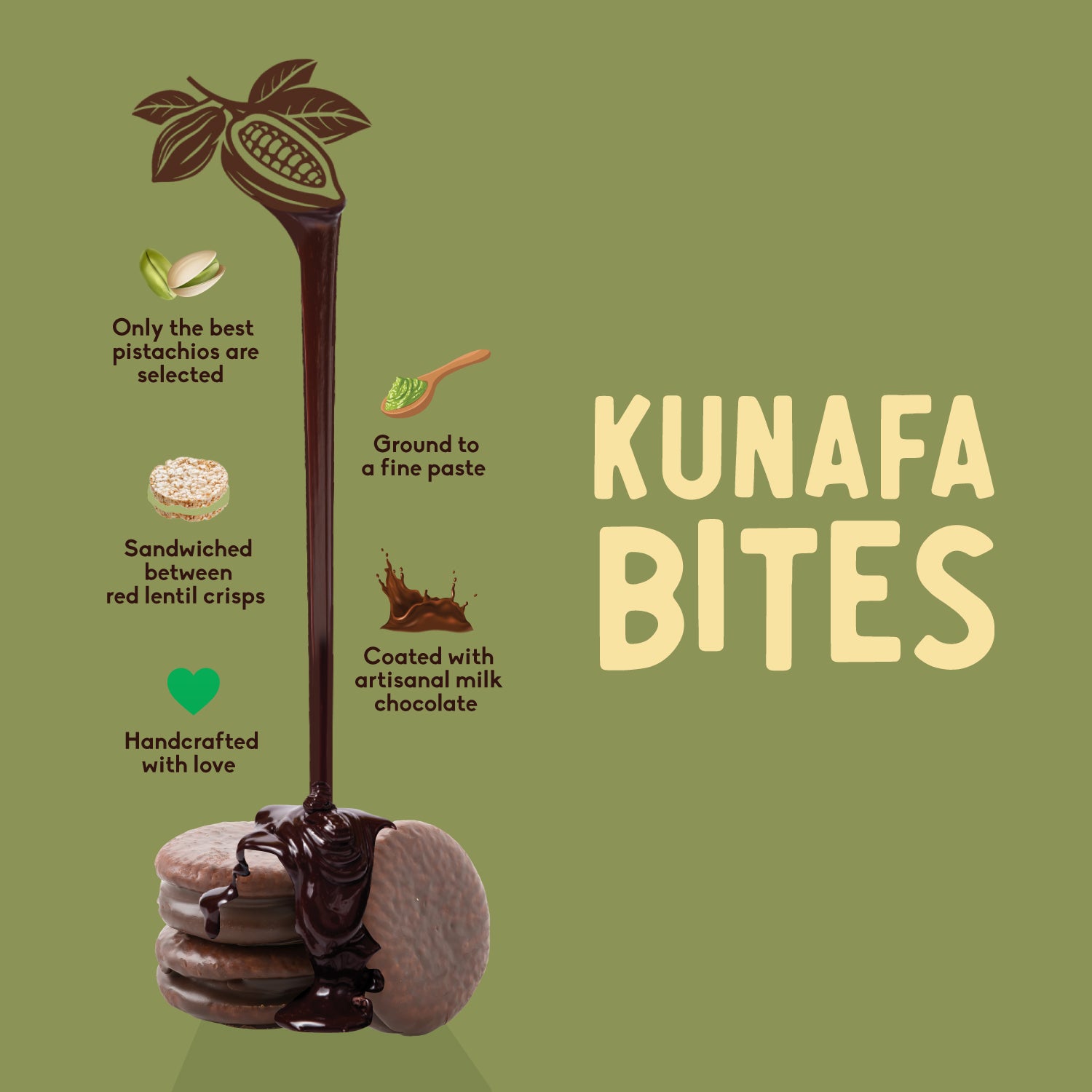 100% pure paste sandwiched between two crunchy red lentil crisps & coated with decadent bean to bar milk chocolate!